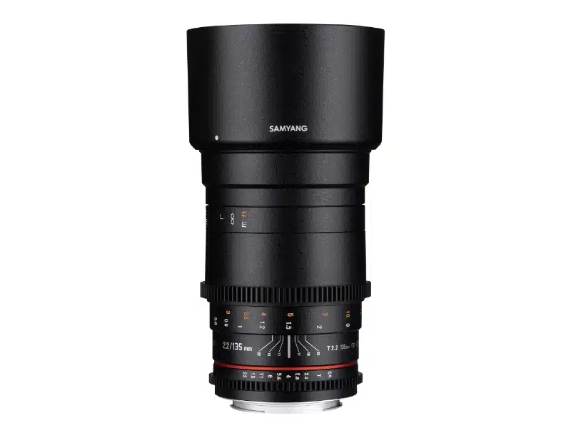 Utilizing a multi-layer coating process for consistent color rendition from lens to lens the Samyang 135mm T2.2 VDSLR II Lens answers the challenge of assembling a set of lenses over time. Features industry standard geared focus and iris rings that share common position with other Samyang VDSLR II lenses. To aid focus pullers who have to work both sides of the lens, the aperture and focus scales are marked on both sides of the lens.