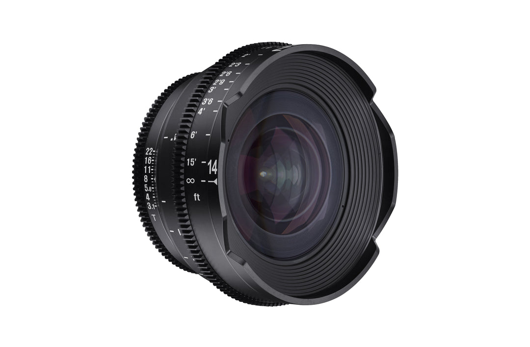 Samyang’s XEEN 14mm T3.1 Lens is built specifically for use as a cinema lens. It features an internal focus design so that the lens does not change size while focusing, minimizing the appearance of breathing when changing focus. Each lens in the set is multi-coated for good contrast, glare prevention, and color-match to a factory standard, allowing you to assemble a set over time with minimal color shift. This 14mm lens provides what is considered an extremely wide angle of view on full-frame cameras, and a tighter angle of view on smaller formats.