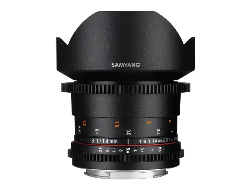 The Samyang 14mm T3.1 VDSLR ED AS IF UMC II Lens was developed primarily for film and video applications. The cine version of Samyang’s 14mm lens features industry-standard gearing for the focus and aperture ring, and the aperture ring has been de-clicked for smooth iris pulls. The aperture and focus scales have also been relocated to the side of the lens, where it is easier for focus pullers to read them.