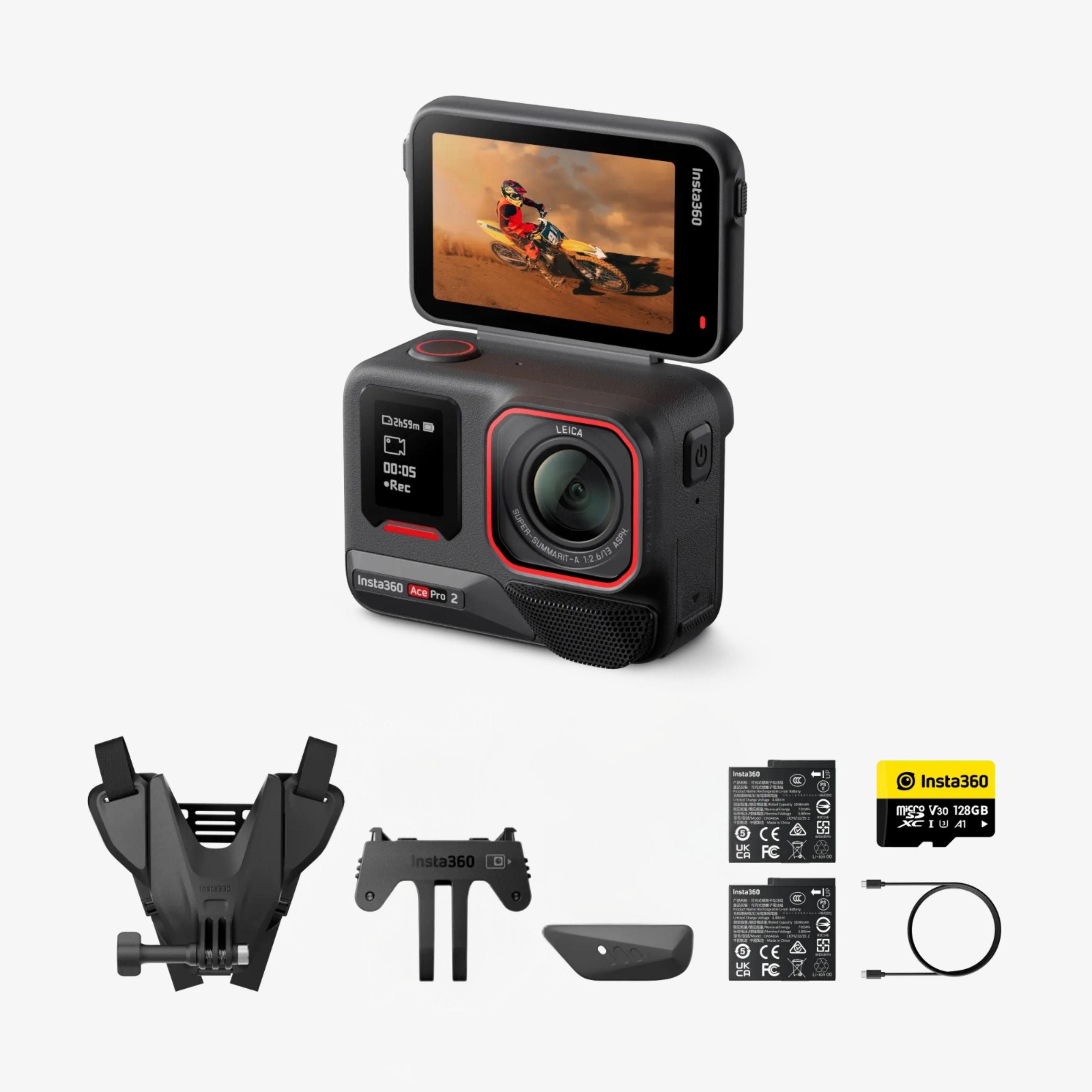 Experience next-level moto vlogging and action capture with the Insta360 Ace Pro 2 Motorcycle Bundle. Designed specifically for riders, this bundle includes the powerful Insta360 Ace Pro 2 camera with a built-in wind guard for crisp, stable footage and clear audio even at high speeds. With two high-capacity batteries and a MicroSD card included, you're fully equipped for long-distance rides and extended shooting sessions.